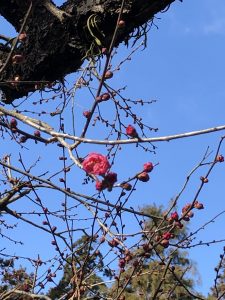 境内の寒紅梅が開花いたしました。例年よりも3週間遅れての開花となります。