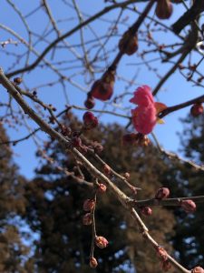 境内の寒紅梅が開花いたしました。例年よりも3週間遅れての開花となります。